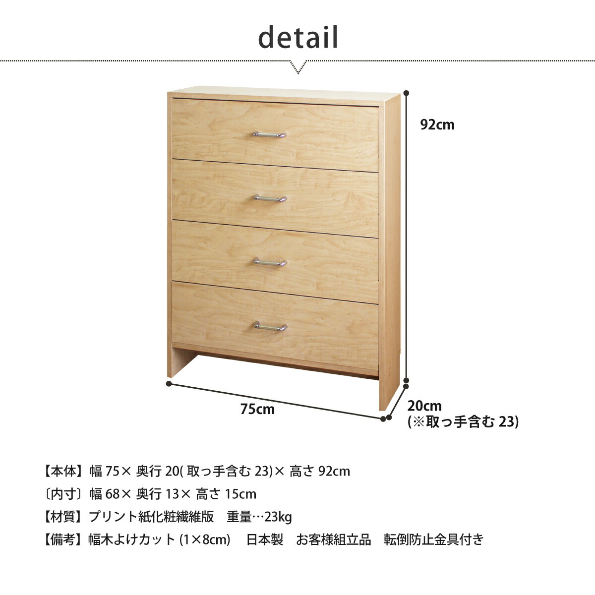 幅75×奥行20(取っ手含む23)×高さ92cm