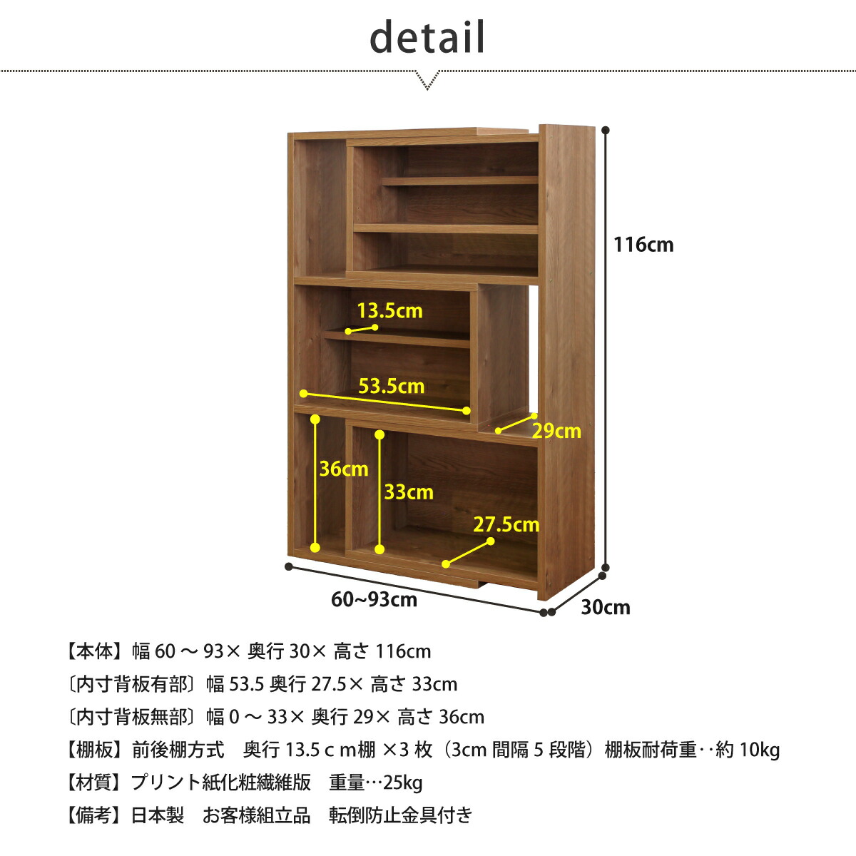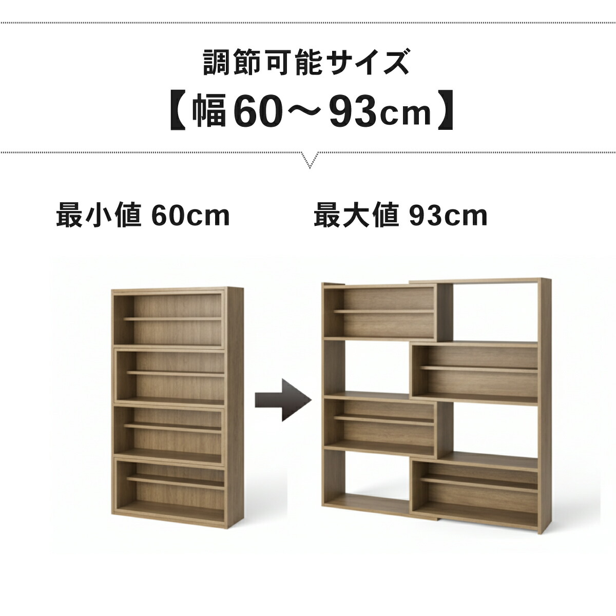 伸縮式ブックシェルフ 3段 幅60~93cm 本棚 伸縮 増やせる 間仕切り 推し活 幅60cm 奥行30cm 高さ116cm mss-63