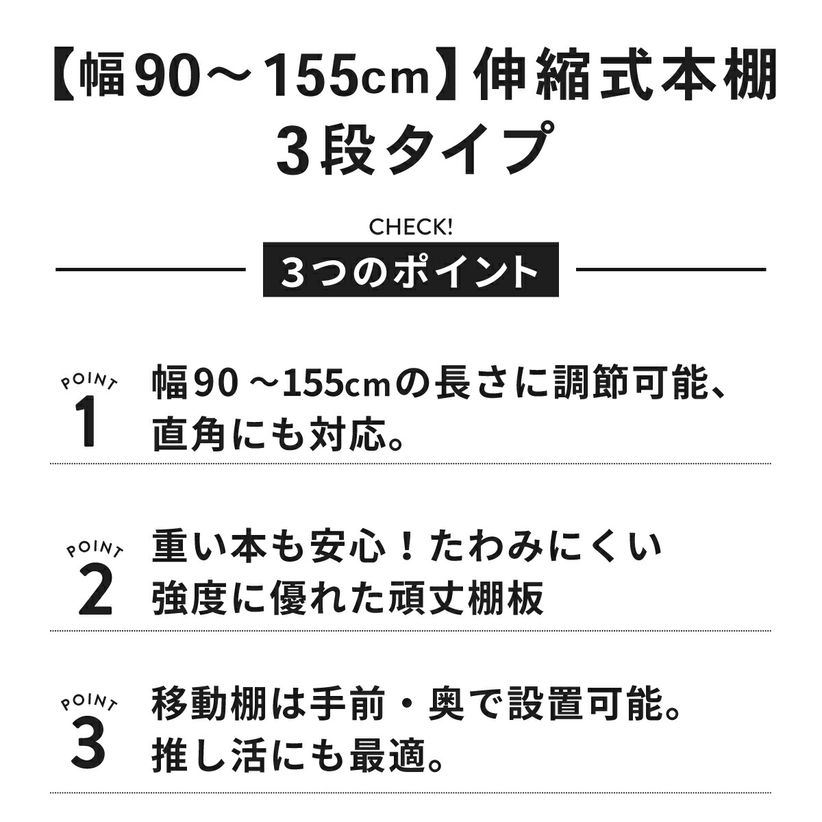 伸縮式ブックシェルフ 3段 幅90~155cm 本棚 伸縮 増やせる 間仕切り 推し活 幅90cm 奥行30cm 高さ116cm mss-93