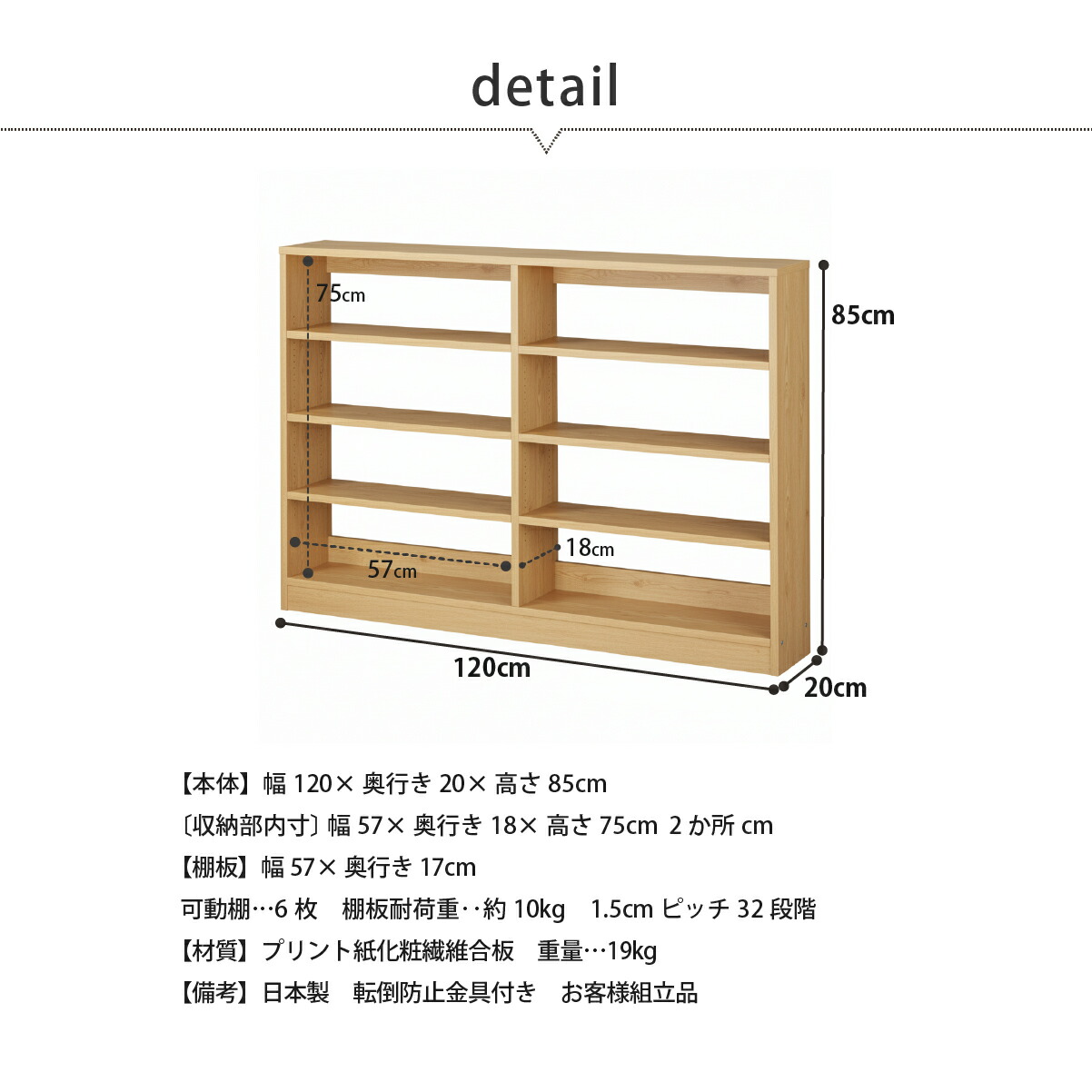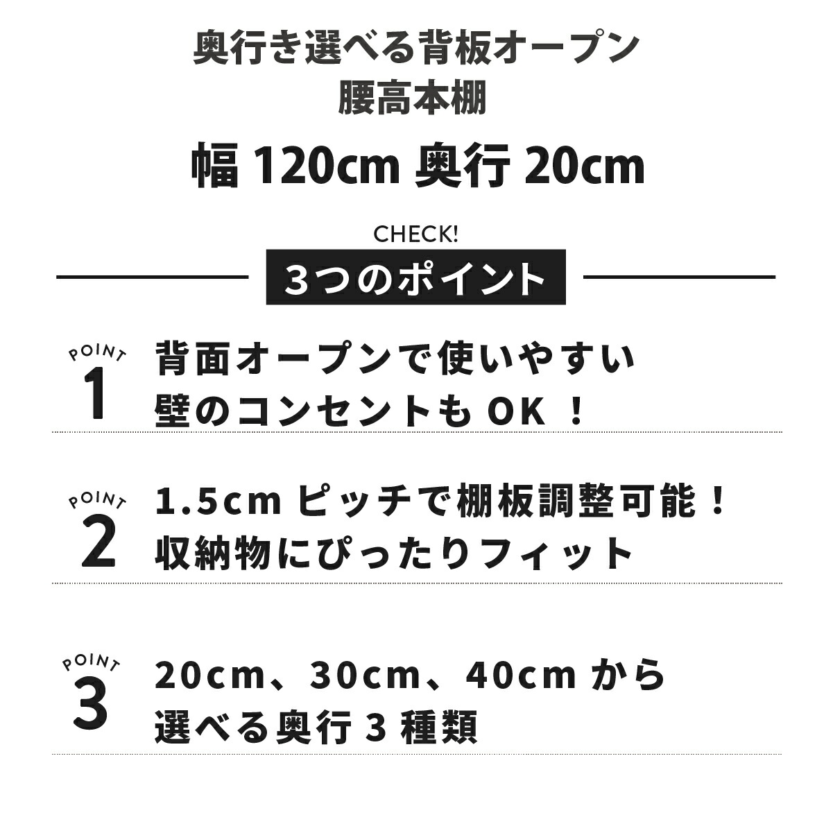 奥行き選べる背板オープン腰高本棚 幅120cm 奥行20cm 高さ85cm kb-122