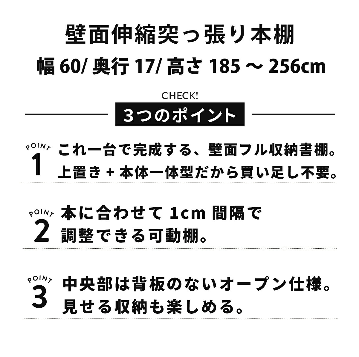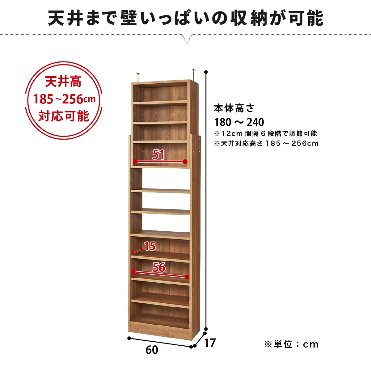 壁面伸縮突っ張り本棚 幅60cm 奥行き17cm 突っ張り使用対応高さ185~256cm lcm-6017d