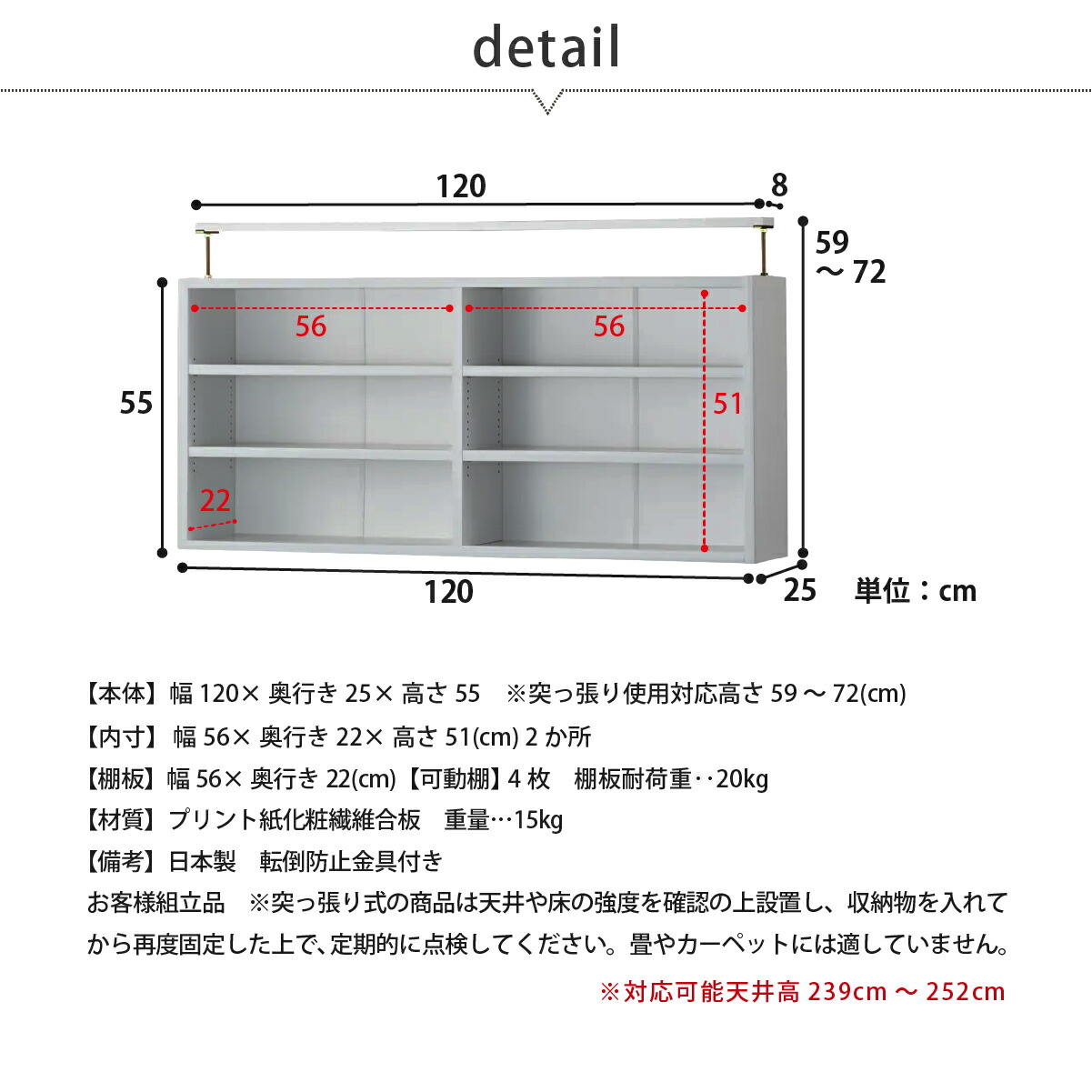 【備考】日本製、転倒防止突っ張り金具付き、お客様組立品