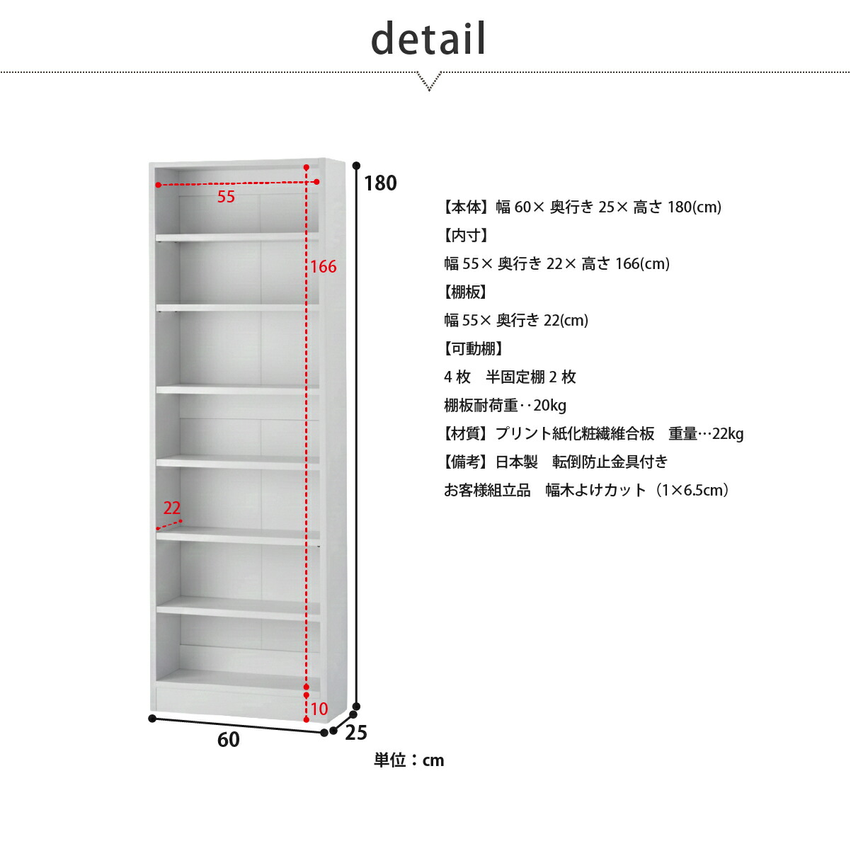 [内寸]幅55cm×奥行き22cm×高さ166cm