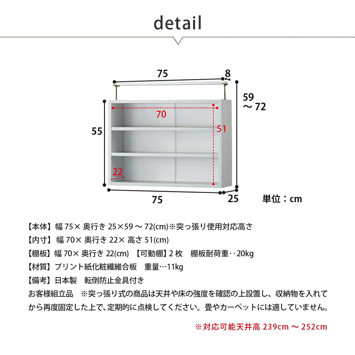 【備考】日本製、転倒防止突っ張り金具付き、お客様組立品