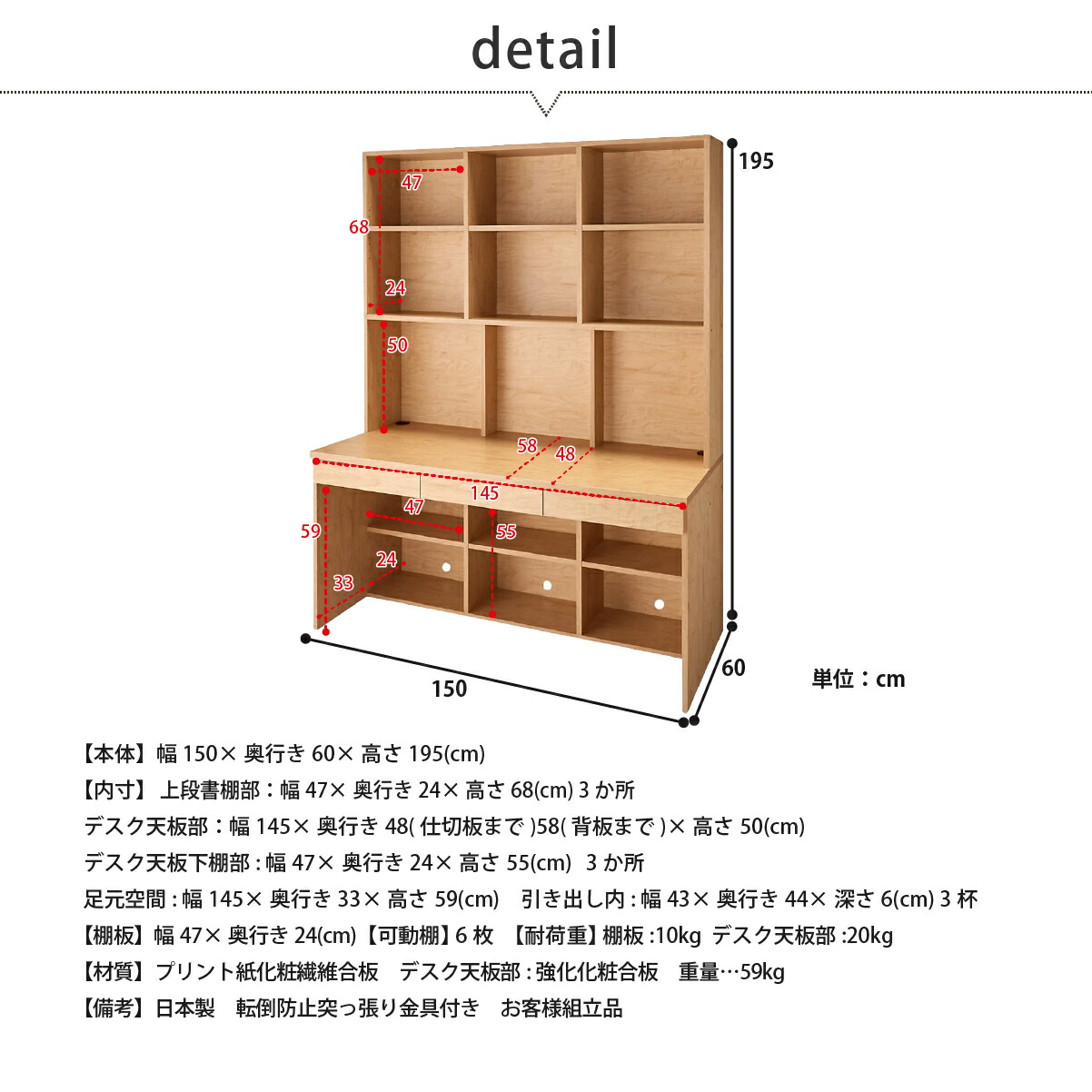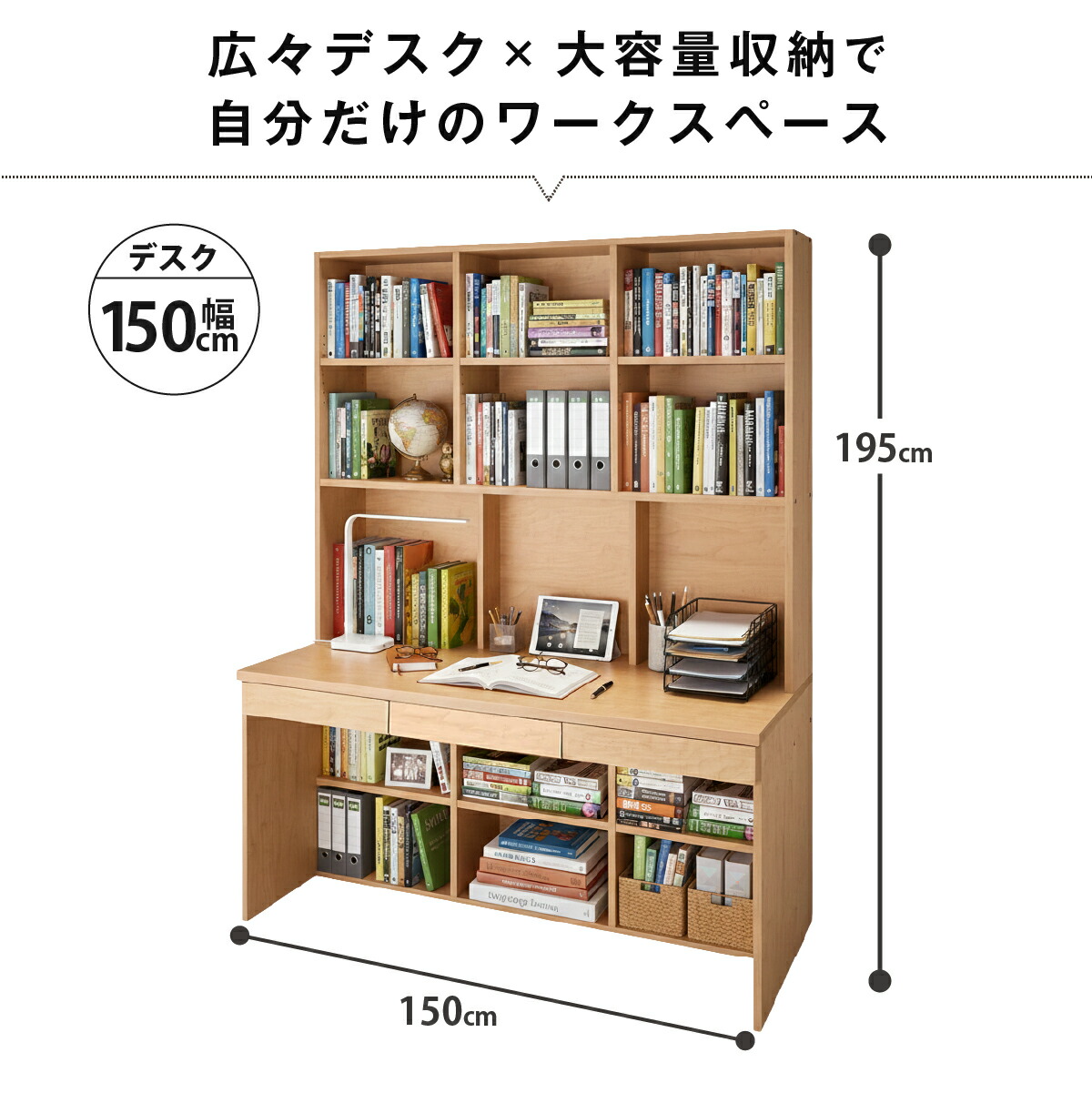 大量収納本棚付き広々デスク 幅150cm 奥行き60cm 高さ195cm tdk-150